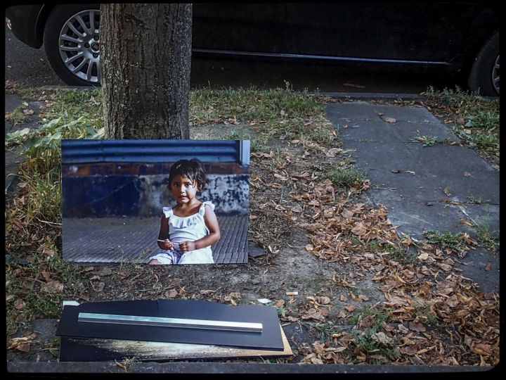 Je presse le pas, déjà en retard à mon rendez-vous. Mais là, je stoppe net devant cette gamine adossée à un arbre qui me fixe de son regard inquiet. Décidemment, elle a déjà prise en photo dans une rue que l'on imagine dans un quartier peu privilégié très loin de chez nous et la voilà de retour à la rue dans un quartier aisé de la capitale de l'Europe. Tout un symbole.