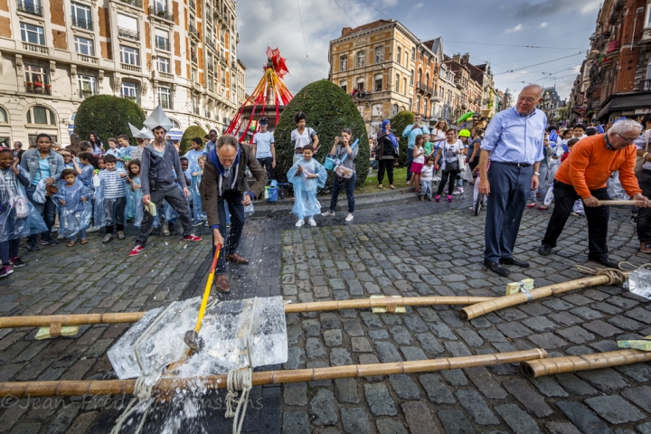 Une grande parade composée de quatre cortèges symbolisant "La force", "La conscience"," L'esprit" et "Les plaisirs" ont convergé vers le rond-point où deux blocs de glace ont été brisés et jetés dans l'eau. Les différents cortèges réunifiés ont poursuivi leur chemin jusqu'à la Place Van Meenen pour se fondre dans un spectacle participatif qui a pris le relais.
