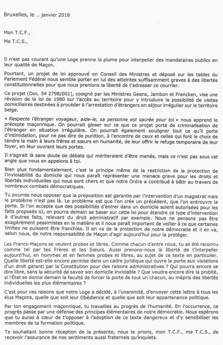 Comme le souligne le texte que nous publions ci-dessous, il est inhabituel d’observer ce type de réaction a fortiori émanant non pas d’une obédience maçonnique mais d’une loge unanime qui a estimé de son devoir de demander aux parlementaires fédéraux belges qui sont maçons de s’opposer à la loi permettant des visites domiciliaires. En général, les principales obédiences belges de la franc-maçonnerie adogmatique (Grand Orient de Belgique, Droit Humain, Grand Loge de Belgique, Grande Loge Féminine de Belgique, Lithos) communiquent uniquement, par exemple via leurs sites, sur la démarche maçonnique ou sur la manière de poser sa candidature. Il arrive exceptionnellement (ce fut par exemple le cas lors de l’attentat visant Charlie Hebdo) qu’une obédience réagisse en tant que telle. Au sein des obédiences, une réflexion traverse périodiquement les frères et les sœurs quant à ce qui est appelé l’extériorisation. Une partie d’entre eux et d’entre elles estiment que si la démarche maçonnique est en même temps cheminement personnel et collectif, il appartient plutôt à chaque frère ou à chaque sœur de transcrire à titre individuel le fruit de ses réflexions. Nul mot d’ordre n’est jamais donné et il y a des maçons dans tous les partis démocratiques. Rien d’ailleurs n’interdit à chacun.e des francs-maçons de révéler son appartenance mais il ou elle ne peut parler qu’en son nom propre. On notera qu’ici, le texte est à usage interne. Une fuite (dont j’ignore si elle est délibérée ou non) en a permis la publication hier sur le site et aujourd’hui samedi 27 janvier 2018 dans l’édition papier. Nous avons jugé utile de le diffuser in extenso. Le voici. (J.R.)