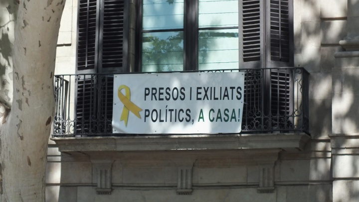 Il n'y a pas qu'une seule fenêtre, sur la Rambla, pareillement décorée à Barcelone, où la langue castillane semble avoir pratiquement disparu. Drapeaux indépendantistes ou slogans pareils flottent un peu partout. Photo © Jean Rebuffat