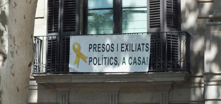Il n'y a pas qu'une seule fenêtre, sur la Rambla, pareillement décorée à Barcelone, où la langue castillane semble avoir pratiquement disparu. Drapeaux indépendantistes ou slogans pareils flottent un peu partout. Photo © Jean Rebuffat