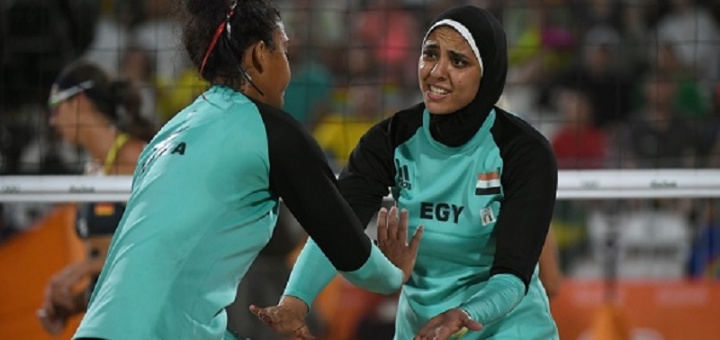 Contrairement à une idée répandue, il n'est pas obligatoire de jouer au beach volley en maillot. La seule exigence est que les deux membres d'une même équipe soient habillé.es identiquement. Mais ici, à Rio en 2016, avez-vous vu les Égyptiennes? L'une est voilée, l'autre non. Photo d'archives D.R.
