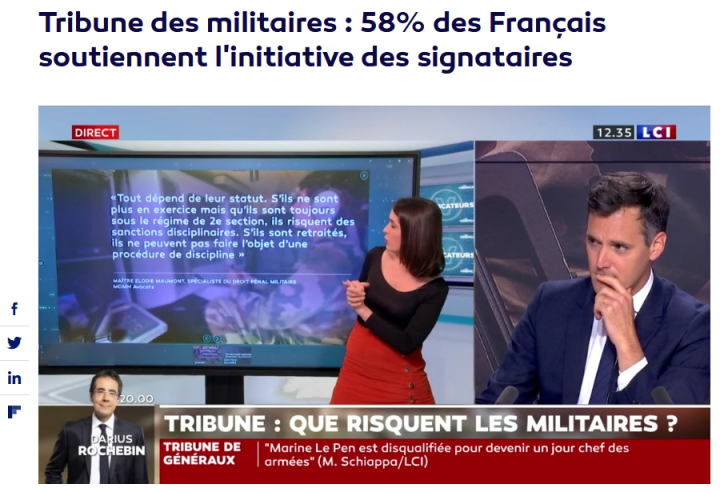 Et apprendre que 58% des citoyens de la République approuvent la fameuse tribune d'un quarteron d'officiers en retraite dans Valeurs actuelles, dénonçant un délitement qui frapperait le pays et annonçant un éventuel soutien aux politiques qui prendront en considération la sauvegarde de la nation n'est pas là pour rassurer. Pétain n'est pas très loin et il n'y a pas qu'en Birmanie que cela se passe.
