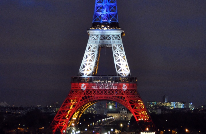 La Tour Eiffel proclamant la devise de la ville de Paris au lendemain des attentats du 13 novembre 2015. Photo libre de droits prise sur Wikipédia et due à Éric Salard.
