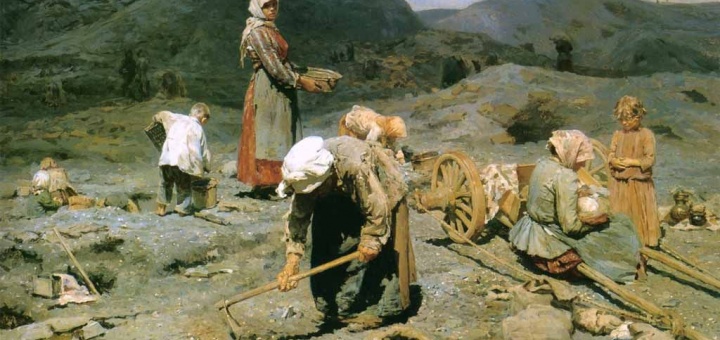 Cette œuvre de Nicolas Kassatkine montre des pauvres ramassant du charbon affleurant dans le Donbass, mot qui est en réalité l'abréviation de bassin minier du Don. Photo d'une peinture datant de 1897 et libre de droits.