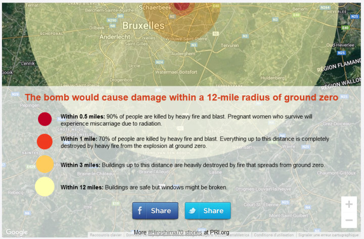 Il y a bien pire que la bombe qui explosa à Hiroshima. La capture d'écran montre ce qu'une bombe du genre ferait dans l'hypothèse où le siège de l'Otan serait frappé. Source https://theworld.org/stories/2015-08-04/what-if-your-hometown-were-hit-h...