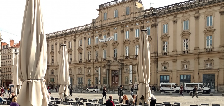 Cette semaine à Lyon, entre deux soirées d'incidents, la place des Terreaux où sur le musée, cette banderole proclame pacifiquement "Votre chef d’œuvre: tuer nos retraites", tandis que veillent les forces de l'ordre... Photo © Jean Rebuffat